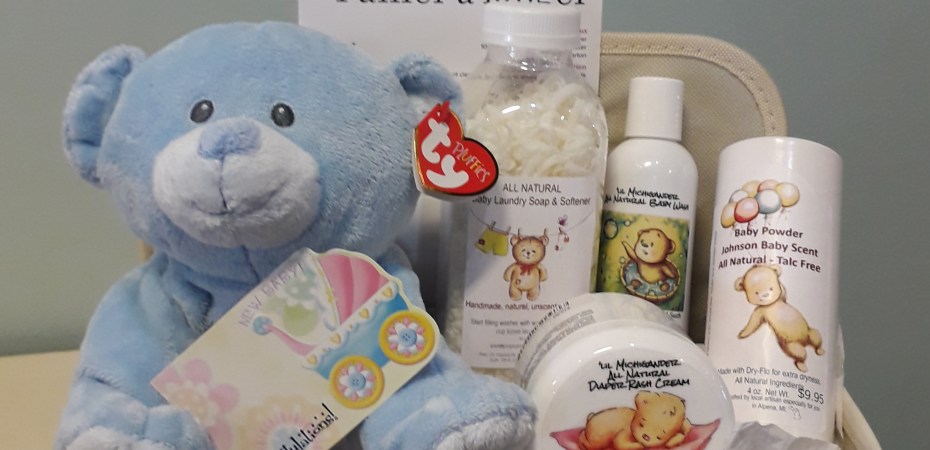 Keep Soaps and Such in mind for gift giving! NATURAL is what we are all about and the NEW Mother will surely love paraben free, wholesome baby products. This two sided Diaper Caddy is full of Soaps and Such natural products. Our Baby line is called “lil Michigander” and was launched because Johnson & Johnson is being sued for toxins in their products. That’s why I went to work developing a wholesome baby line…to keep your baby healthy and you with healthy choices!